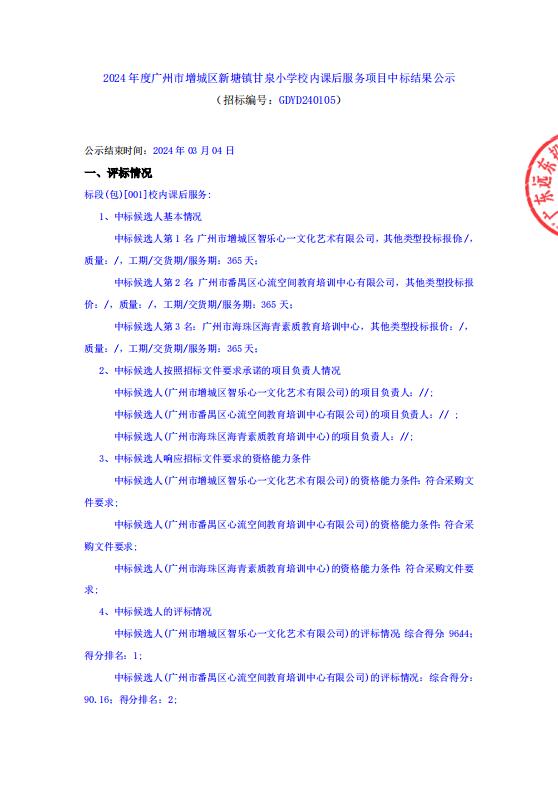 2024年度廣州市增城區(qū)新塘鎮(zhèn)甘泉小學(xué)校內(nèi)課后服務(wù)項目中標結(jié)果公示